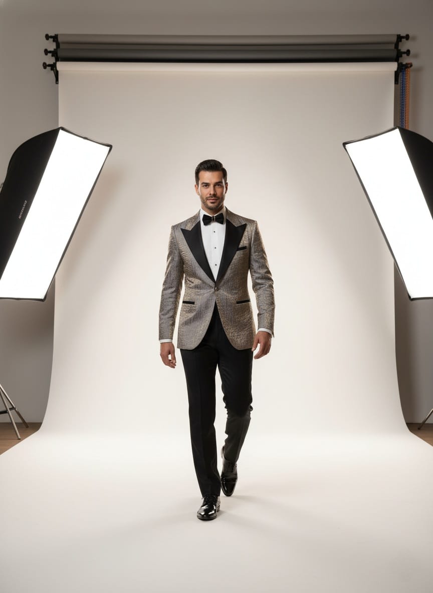 EFFETTI BY Giovanni Testi 2 Piece Slim Fit Iridescent Gold Crinkle Fabric, Black Satin Peak Lapel, 1 Button, Center Vent.