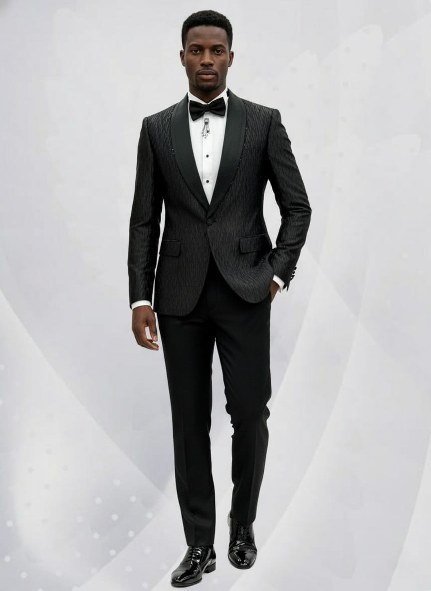 GIOVANNI TESTI 2 Piece Slim Fit Suit, Black Pleated texture fabric, Black Satin Shawl Lapel with Black Bead Trim, 1 Button, Center Vent and Black Satin Pants.