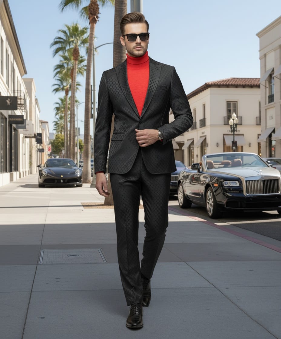 GIOVANNI TESTI 2PIECE SLIM FIT SUIT WITH BLACK ON BLACK GRAPHIC PATTERN, SIDE VENTS, 1 BUTTON, PEAK LAPEL.