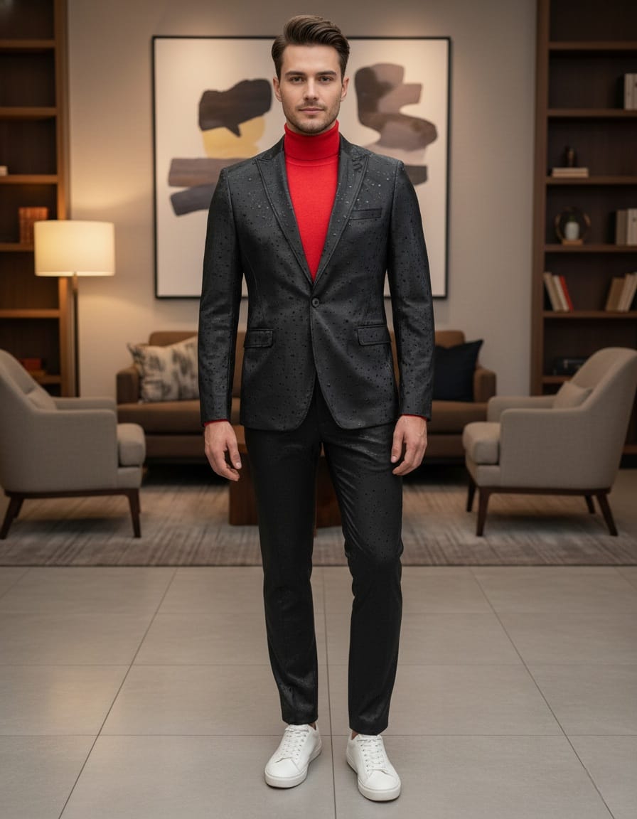 GIOVANNI TESTI 2PIECE SLIM FIT SUIT WITH STRETCH CONSTRUCTION, BLACK RAIN PATTERN, FAUX LEATHER FABRIC, SIDE VENTS, 1 BUTTON, PEAK LAPEL.