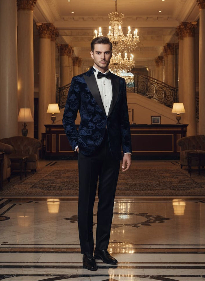Giovanni Testi Slim Fit Velvet Jacket, Paisley Pattern, 1 Button, Black Satin Peak Lapel, Side Vents. Jacket only.
