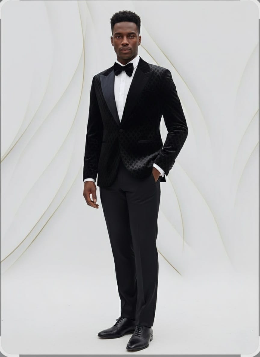 EFFETTI BY Giovanni Testi 2 Piece Slim Fit Velvet Suit, Diamond pattern, Black Satin Peak Lapel, 1 Button, Center Vent, Black Satin Pants.