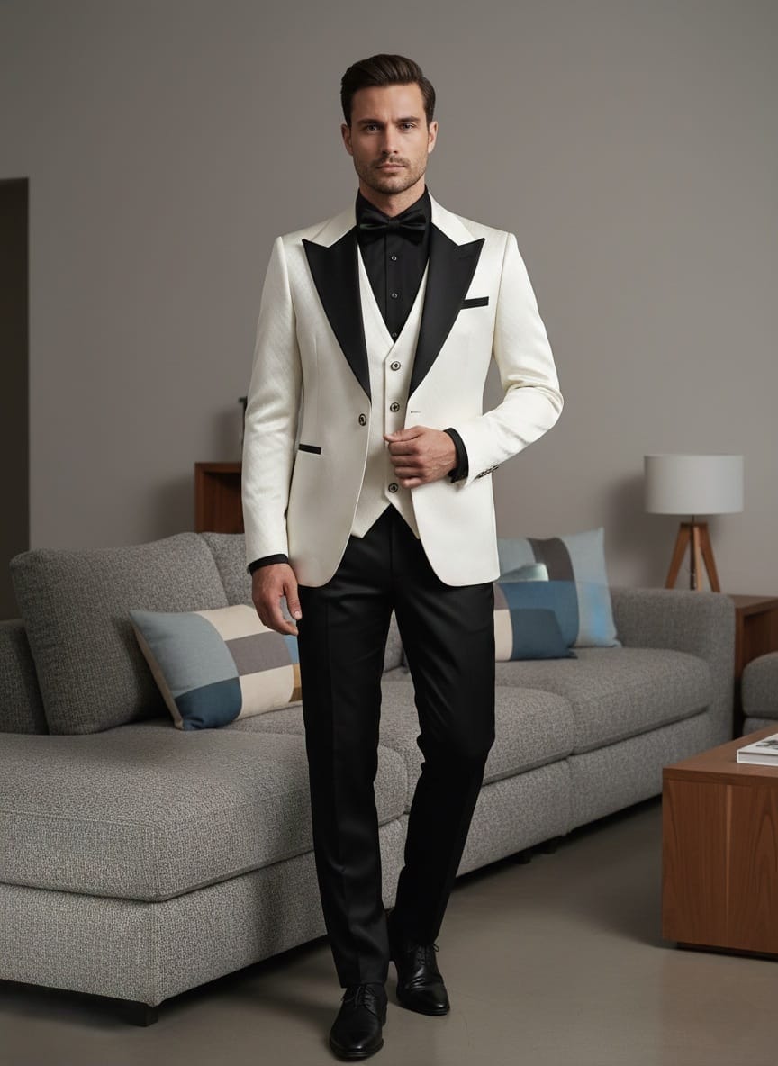 EFFETTI BY Giovanni Testi 3 Piece Slim Fit Suit, Ivory - Diamond Design, Black Satin Peak Lapel, 1 Button, Center Vent.