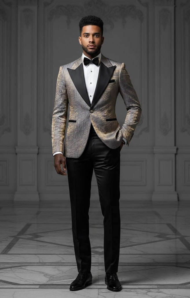 EFFETTI BY Giovanni Testi 2 Piece Slim Fit Iridescent Gold Crinkle Fabric, Black Satin Peak Lapel, 1 Button, Center Vent.