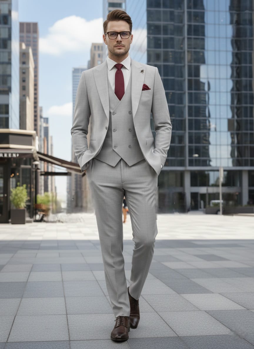 GIOVANNI TESTI SLIM FIT 3 Piece Suit, Peak Lapel, 1 Button, Double Breast Vest, Center Vent.