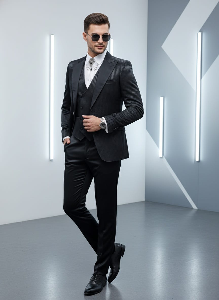 GIOVANNI TESTI 3 Piece Slim Fit Suit, Square tone on tone pattern, Satin Peak Lapel, 1 Button, Center Vent matching satin pants.