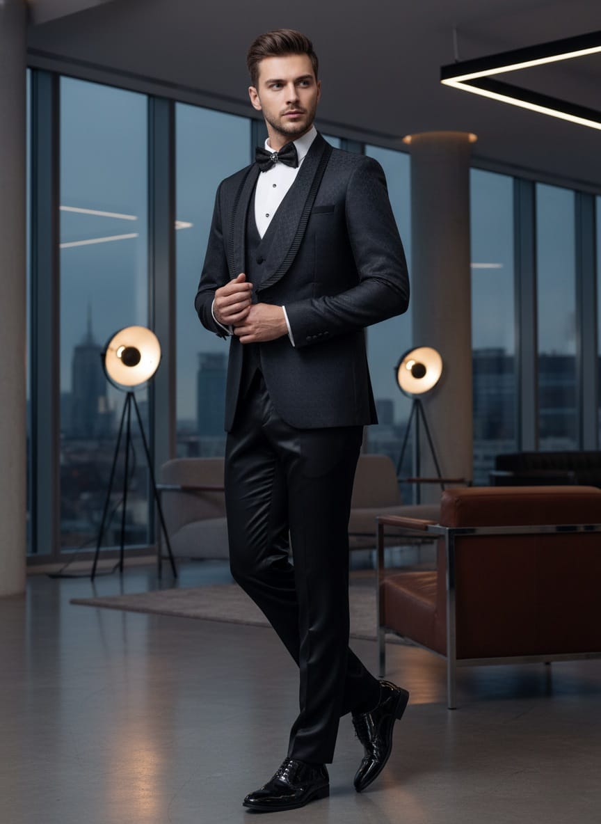 EFFETTI BY Giovanni Testi 4 Piece Slim Fit Suit, Circle pattern tone on tone fabric, Shawl Lapel with pleated trim, 1 Button, Center Vent, Matching Bow Tie.