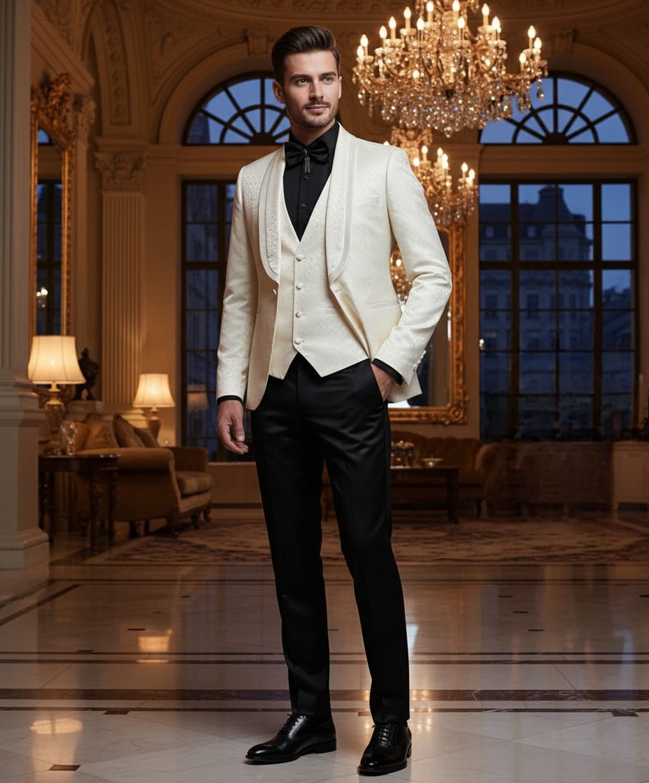 EFFETTI BY Giovanni Testi Slim Fit Suit, Circle pattern tone on tone fabric, Shawl Lapel with pleated trim, 1 Button, Center Vent, Matching Bow Tie.