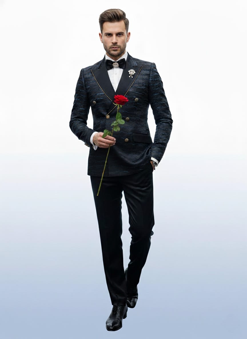 GIOVANNI TESTI 2 Piece Double Breast Slim Fit Suit, Black Blue Crinkle fabric, Black Satin Peak Lapel with Jewel Trim, 6 Button with Center Vent. Black Satin Pants.