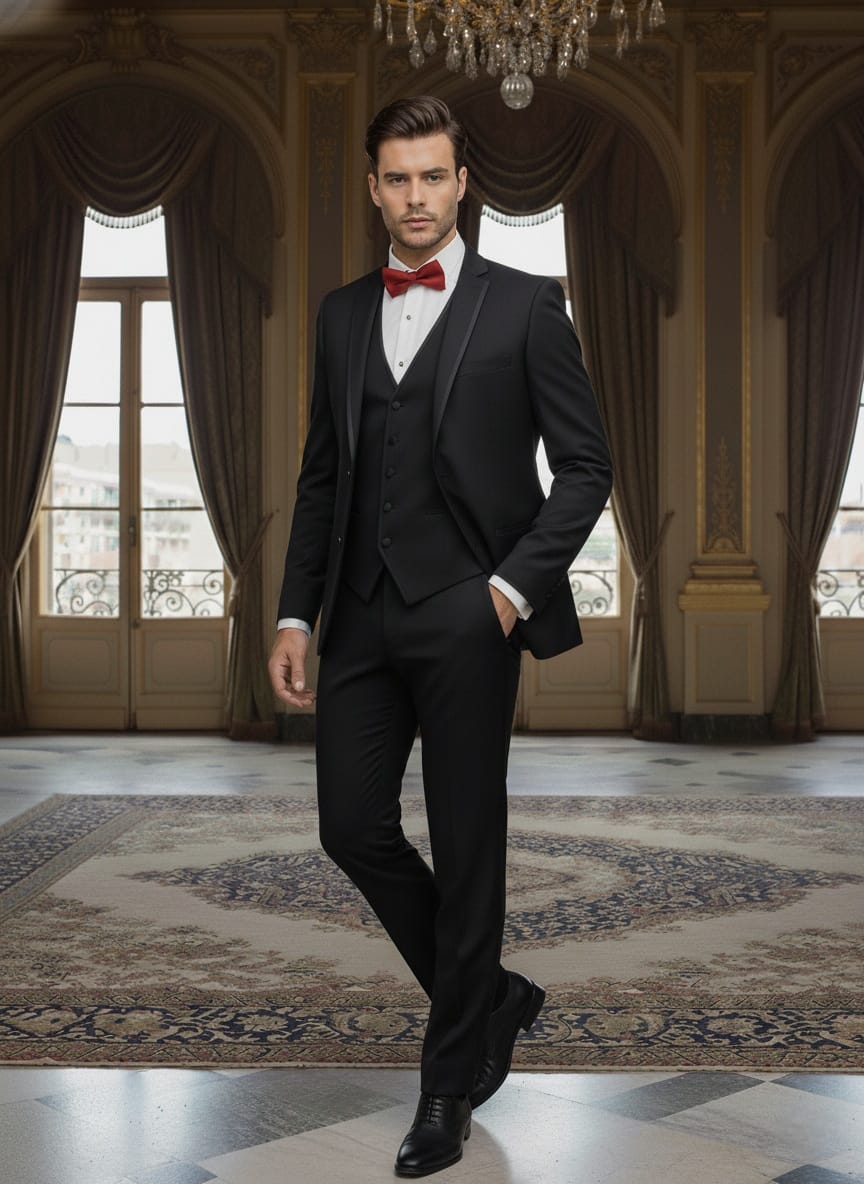 FABIO FABRINNI 3PC SLIM FIT SUIT, 2 BUTTON, SATIN TAPING, MATCHING VEST WITH TAPING. No taping on pants. FLEX WAIST STRETCH.